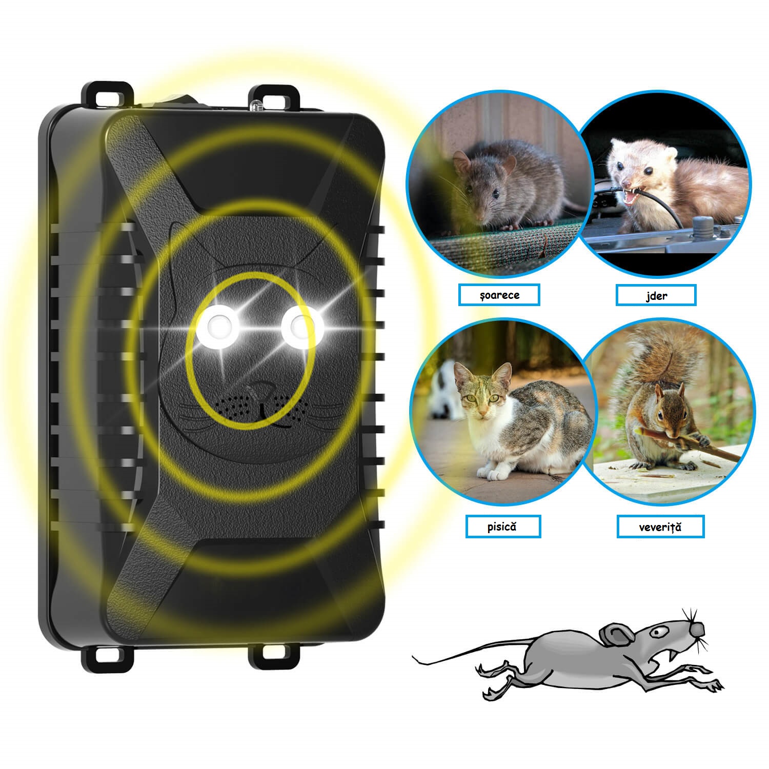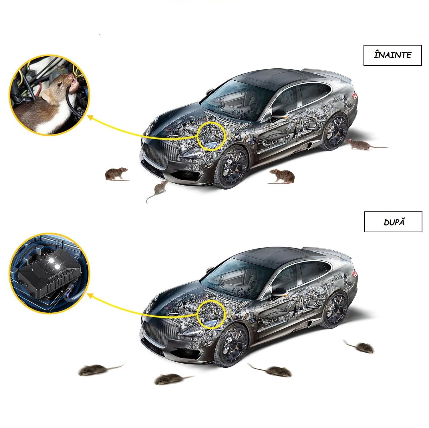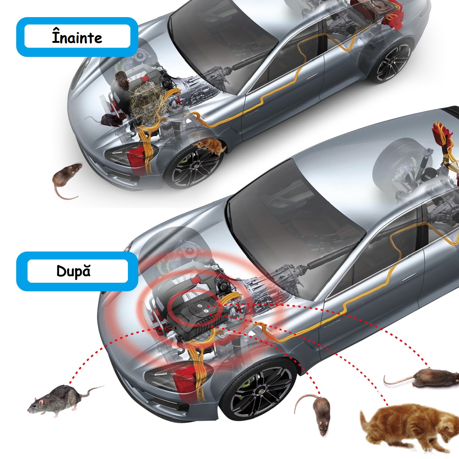- Ultrasunetele și luminile împiedică rozătoarele să se apropie și să atace cablurile. Funcționează eficient și este inofensiv pentru oameni și vehicule.