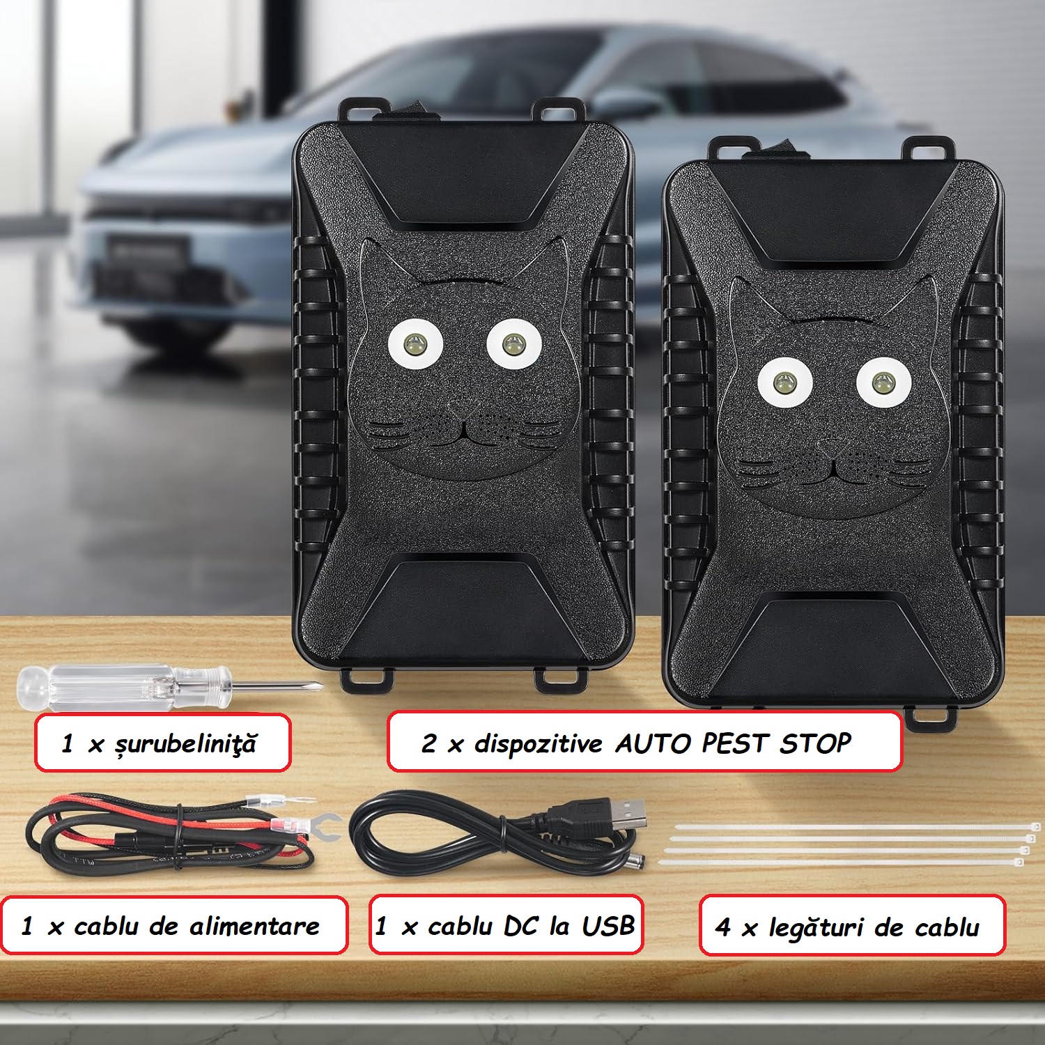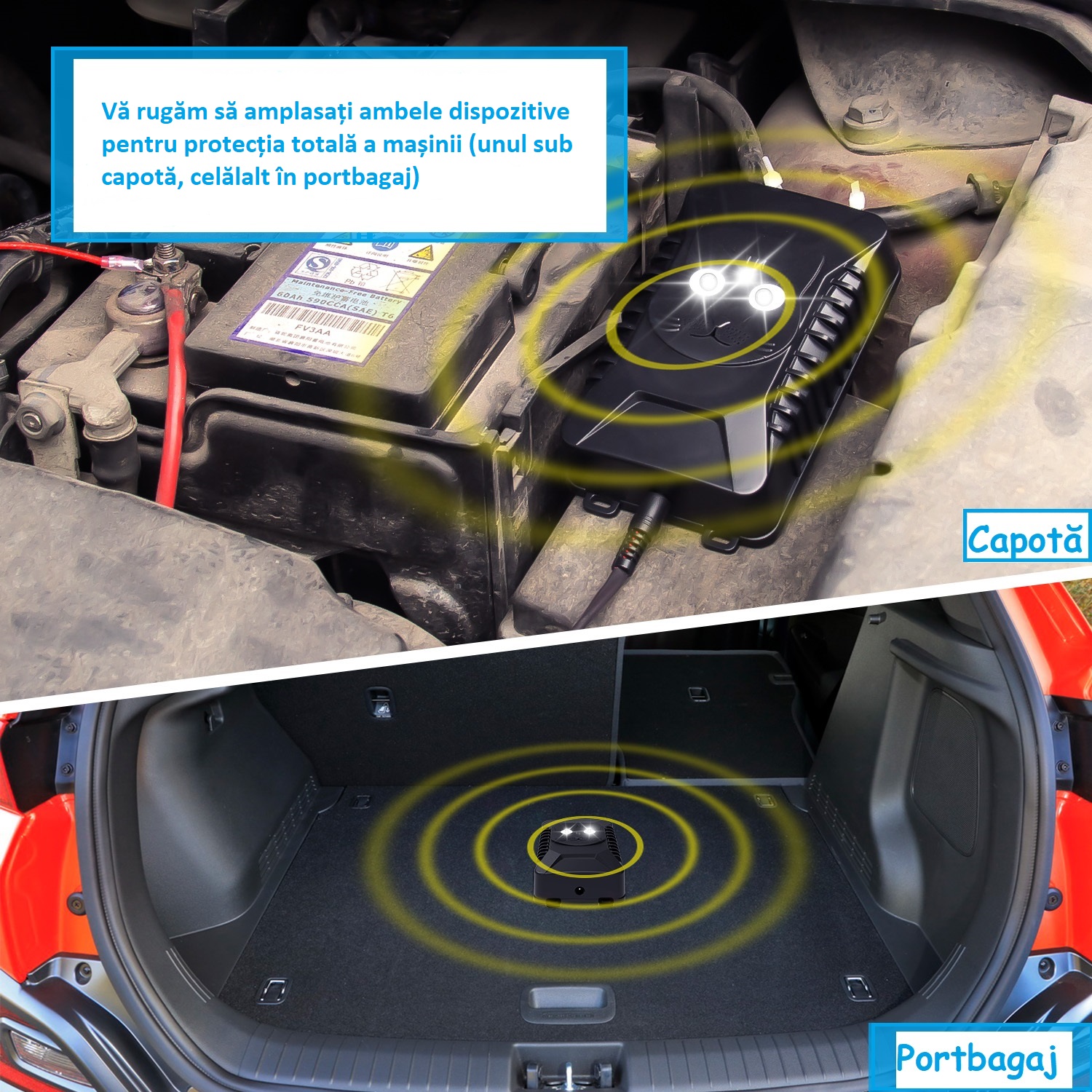 - Pentru a spori eficiența și a înlătura mai repede dăunătorii, unul dintre dispozitive se poate monta la bateria mașinii, iar celălalt în portbagaj, alimentat de baterii AA.