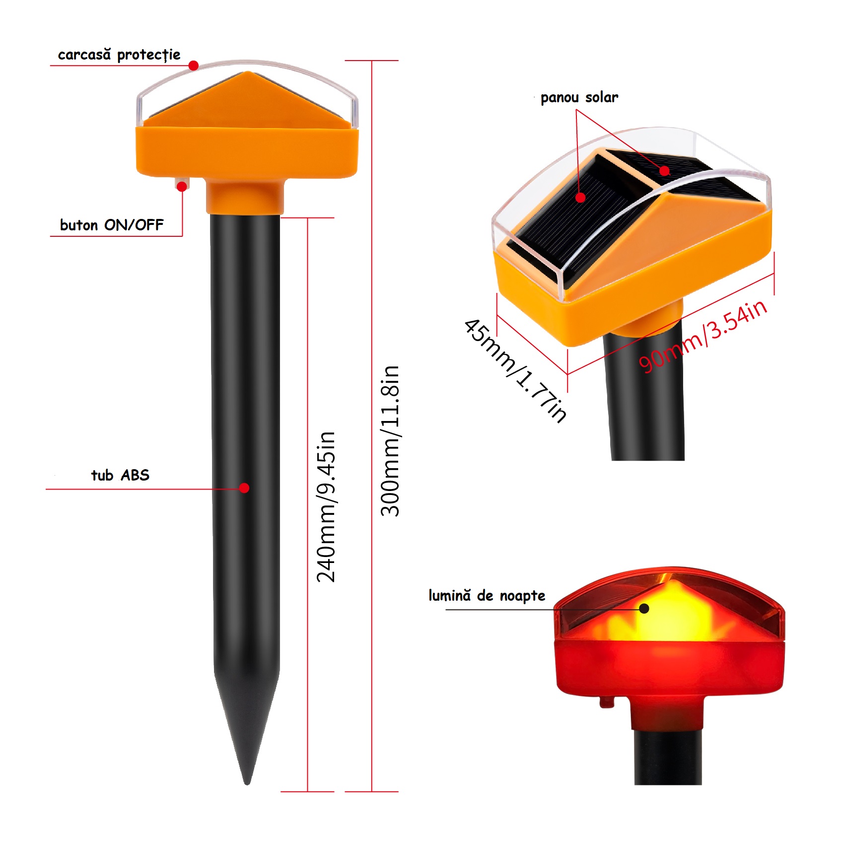 Lumina LED încorporată nu va funcționa în timpul zilei, dar se va aprinde automat noaptea. Lumina va sta aprinsă timp de 6 ore, apoi se va opri automat.