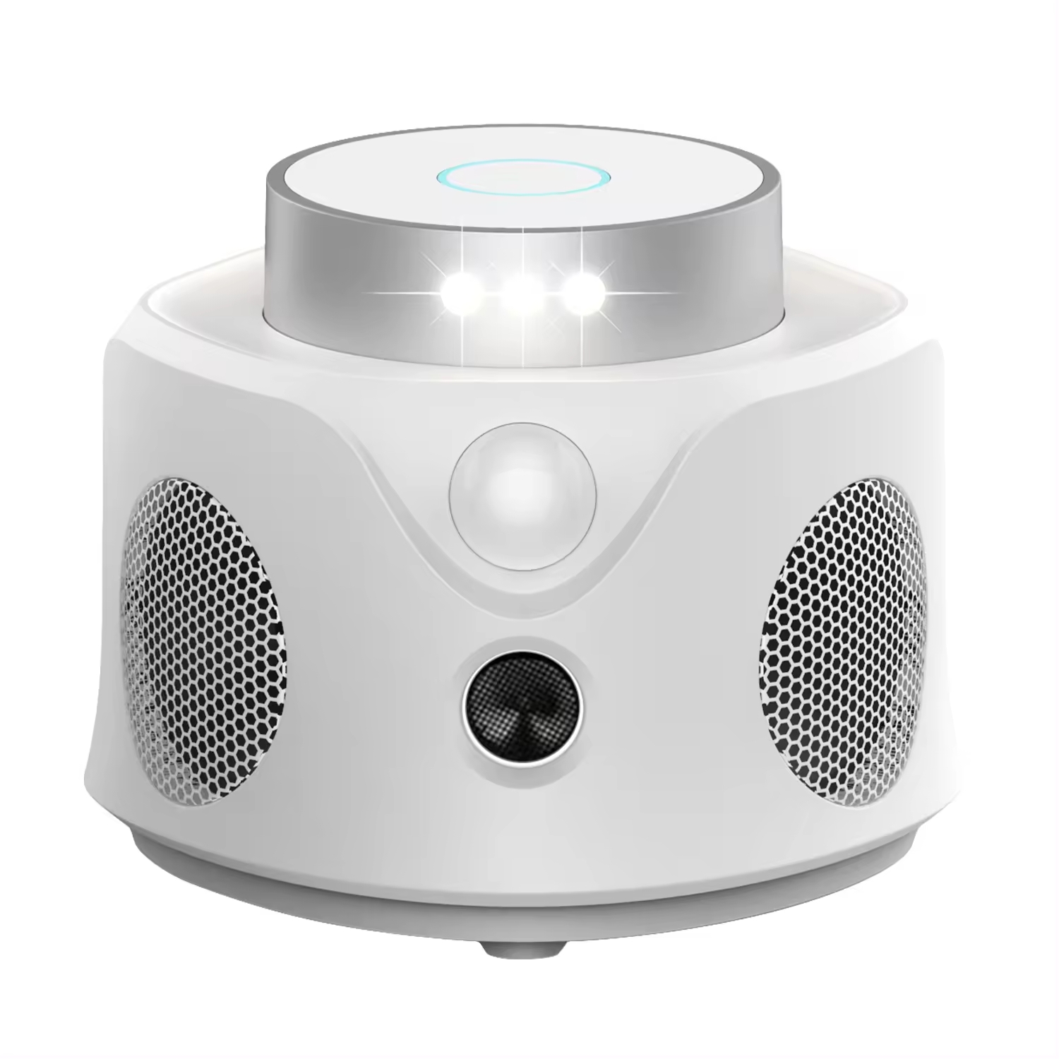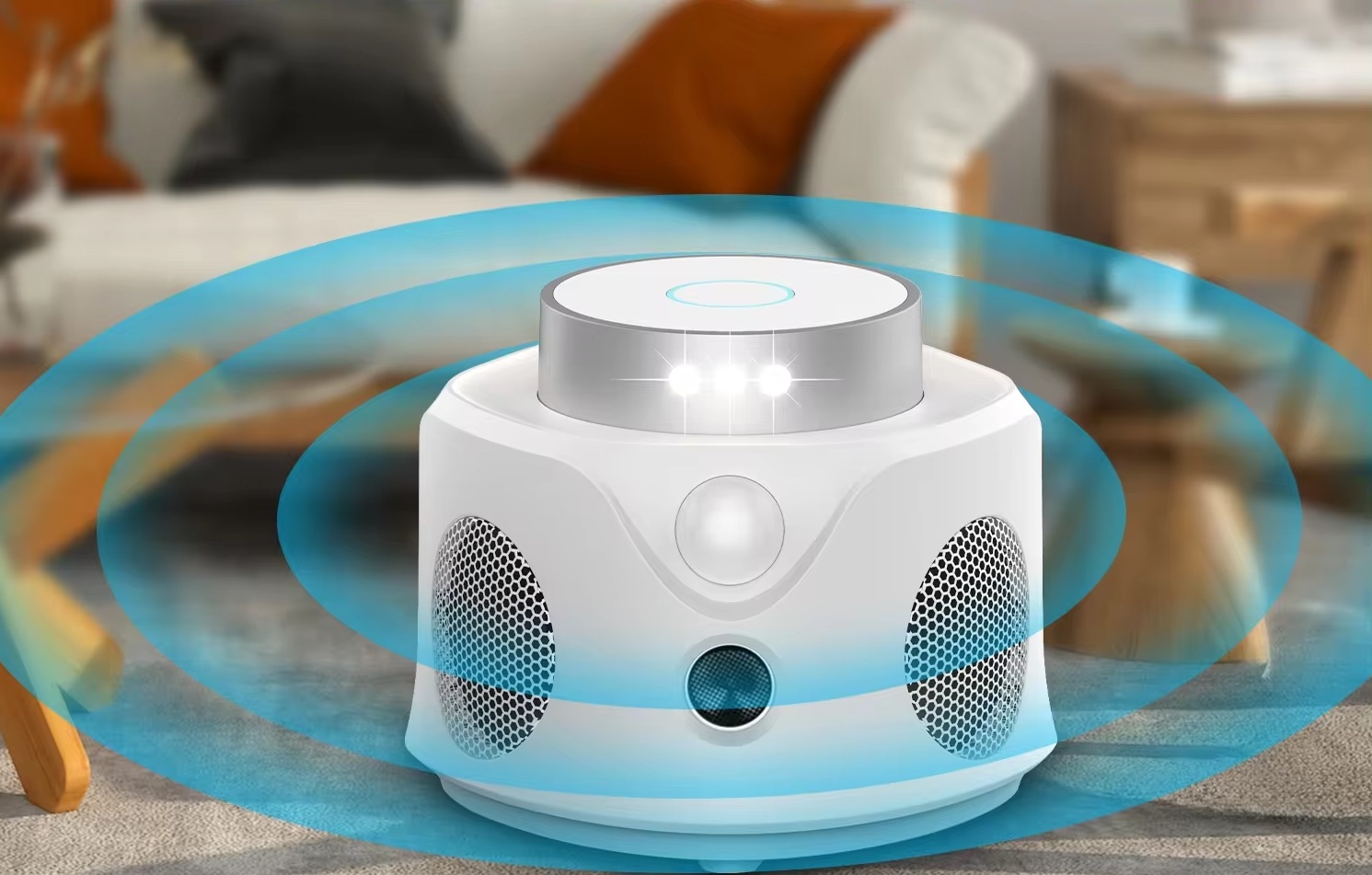 MODUL 1 – (pentru utilizare în timpul zilei): indicatorul albastru se aprinde și apoi se activează cele 3 difuzoare cu ultrasunete, cu frecvență variabilă și 1 difuzor cu ultrasunete cu frecvență fixă.
