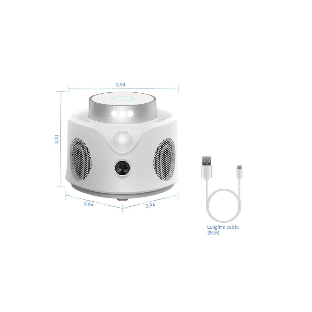 MODUL 2 – (pentru utilizare pe timp de noapte): indicatorul verde se aprinde și apoi se activează cele 3 difuzoare cu ultrasunete, cu frecvență variabilă.
